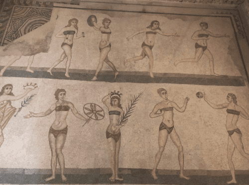 On our way to Modica we made a stop at the Villa Romana del Casale, a large and elaborate Roman villa located about three kilometres from the town of Piazza Armerina. Excavations have revealed one of the richest, largest, and varied collections of Roman mosaics in the world, for which it has been designated a UNESCO World Heritage Site. It was built in the fourth century, but by whom and for what purpose is open to debate. One theory is that its owner was a very successful importer of wild animals for use in circuses and the Coliseum in Rome. The massive expanse of floor mosaics feature lots of animals, but there are other interesting images too, like a collection of women athletes limbering up. This was pretty risqué stuff for the time because they were dressed in what looks like 1940s two-piece bathing costumes.