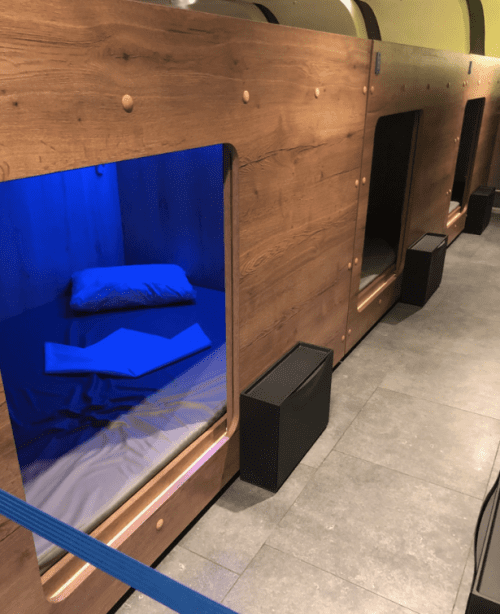 Inside St Petersburg airport is another interesting way to create a transit hotel. Called a Capsule Hotel, it comprises rows of wooden boxes (like Great Dane kennels) with mattresses for floors, a pillow and a towel. You crawl in (accompanied if lucky) and slide the door shut. I guess you use bathroom facilities in the airport. Cost was 500 roubles an hour (about A$13).