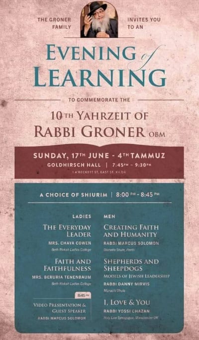 I personally accept that in the light of today’s standards, Rabbi Groner made a misjudgement in dealing with sexual abusers at the Yeshivah Centre. I also accept that all Australians should stand up against all abuse, sexual and otherwise. Yes, ask questions whether the Yeshivah Centre (as well as all other Australian institutions) have put measures in place to prevent and deal with abuse. However is an evening of learning commemorating Rabbi Groner’s yahrzeit the appropriate venue for this? I don’t think so; ECAJ, you really got it wrong this time.