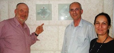 Yitzhak Treister, Michael Kuttner and Tali Dowek looking at a plaque in the lobby of the new tower block at Hadassah Hospital – Ein Karem Campus. The plaque records the support of the Lady Marion Davis Trust.