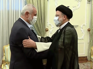 Iranian President Ebrahim Raisi (right) greets Hamas political bureau chief Ismail Haniyeh in Tehran, Aug. 7, 2021. Source: YouTube/Screenshot