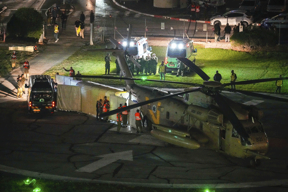 A helicopter carrying hostages released by Hamas lands at Schneider Children’s Medical Center in Petah Tikva, Israel on Friday, Nov. 24, 2023. (AP Photo/Ohad Zwigenberg)