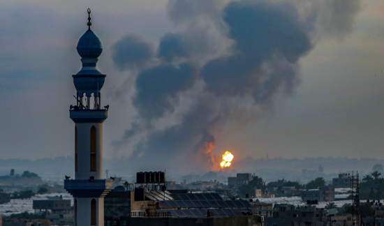Flames rise after an Israeli airstrike on a site of the Izz al-Din al-Qassam Brigades, the armed wing of Hamas, west of Khan Yunis in the southern Gaza Strip, on May 11, 2021. Photo by Abed Rahim Khatib/Flash90.