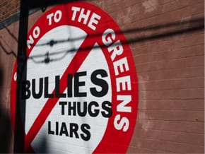The mural has gone over many changes in the last two years; Say No To Burqas, Say No To The KKK, Say No To The B.D.S. (Bad, Dumb, Stupid), Say No To Fiona Byrnes, ‘Gangreen’, Say No To Female Genital Mutilation, Say No To Submission and currently, Say No To The Greens – Bullies, Thugs, Liars.