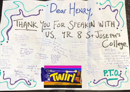 The heartfelt thank you card from the students featured a Twirl chocolate bar.