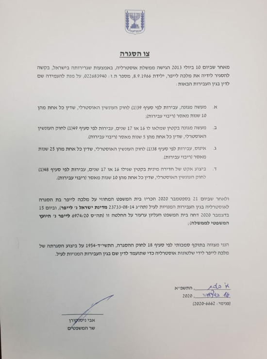 On July 10, 2013, the Australian government, through its embassy in Israel, submitted an application for the extradition of Malka Leifer, Born 8.9.1966, I.D 022683940, to stand trial for the following offences: