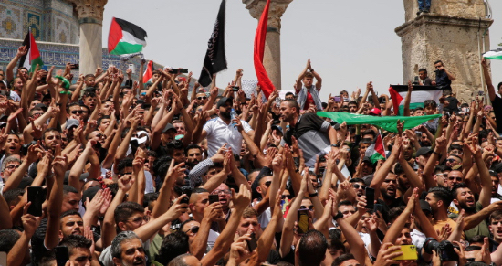 Palestinians protest at the Al-Aqsa mosque compound in Jerusalem’s Old City, May 21, 2021. Photo by Jamal Awad/Flash90