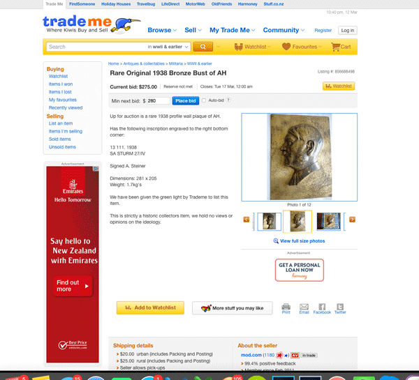 The listing did not stay up for very long, and there was little interest in the item. The bust was listed for only a few hours before it was removed by a Trade Me ‘administrator’.
