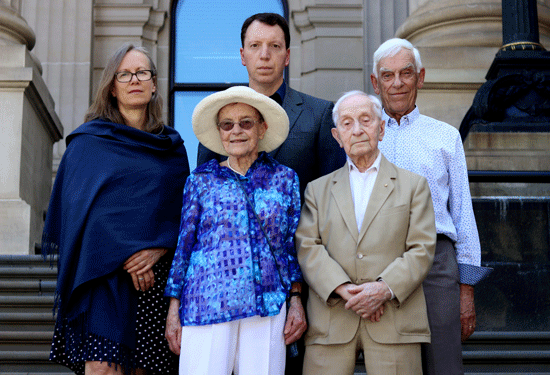 Melbourne Holocaust Museum CEO Jayne Josem, Anti-Defamation Commission chair Dvir Abramovich and Holocaust survivor Jack Leder, and second row Holocaust survivors Abram Goldberg and Sarah Saaroni.