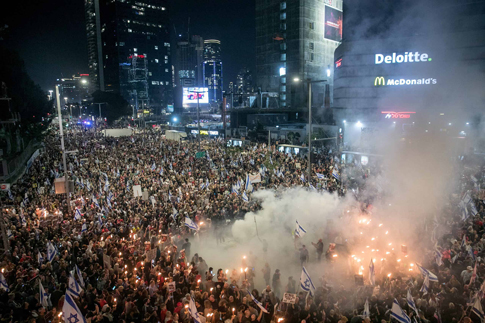 Sixteen people were arrested during the anti-government protest in Tel Aviv for blocking roads and violating public order, according to police, who used water cannons to disperse the demonstrators.