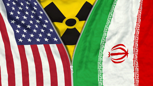 A graphic depicting the American and Iranian flags with a radioactive symbol. Credit: Belus/Shutterstock.