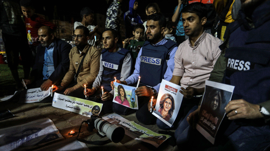Palestinian journalists take part in a candlelight vigil in the Gaza Strip in memory of Al-Jazeera journalist Shireen Abu Akleh, who was killed during a raid of Israeli security forces in the West Bank city of Jenin on May 11, 2022. Photo by Abed Rahim Khatib/Flash90.