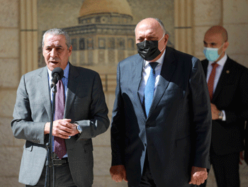 Palestinian Authority Minister Hussein al-Sheikh (left) welcomes Egyptian Foreign Minister Sameh Shoukry to Ramallah, July 24, 2021. Photo by Flash90.