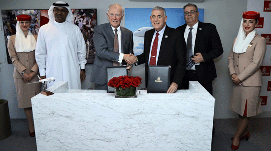 Israel Aerospace Industries announced an agreement to convert four B777-300ER passenger aircraft into cargo planes for the Emirates airline, with representatives from both sectors at the signing on Nov. 15, 2021. Credit: Courtesy