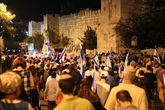 Thousands of Jews march in a demonstration around the walls of Jerusalem’s Old City, calling on the Israeli government to allow Jewish prayer at the Temple Mount, on the eve of the Tisha B’Av day of Jewish mourning July 31. Credit: Gershon Elinson/Flash90.