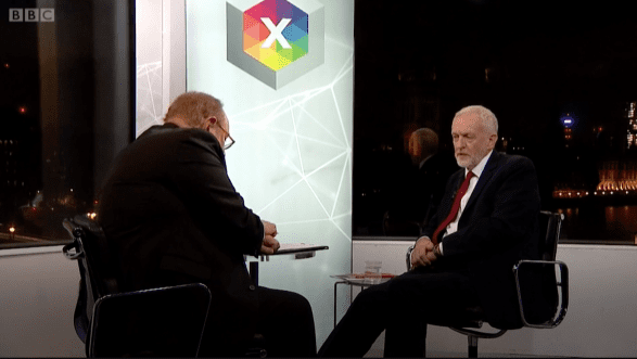 In a BBC interview with Andrew Neil, British Labour Party leader Jeremy Corbyn is pressed over his handling of antisemitism within his party, Nov. 26, 2019. Source: Screenshot.