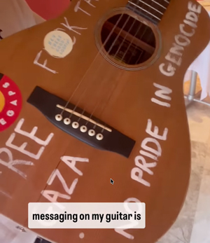 The phrases “Free Gaza” and an expletive directed at the Israeli Defence Forces were also scrawled on the guitar, but he claims the department staff took particular issue with the phrase about genocide.