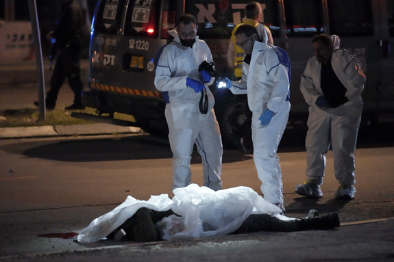 Israeli police stand next to a body of a victim as they inspect the scene of a shooting attack In Hadera, Israel, Sunday, March 27, 2022. AAP