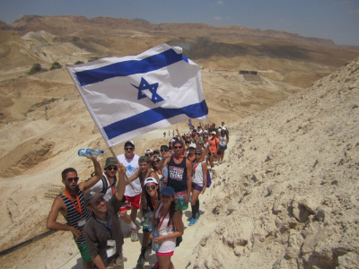 Birthright participants hike up Masada, Israeli flag in hand. Credit: Birthright Israel.