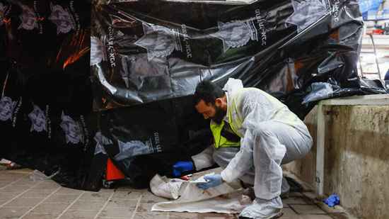 Members of the Zaka organization work at the scene of a shooting attack in Bnei Brak, March 29, 2022. Photo by Olivier Fitoussi/Flash90.