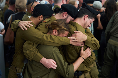 Israeli soldiers stand in a group hug as they mourn Master Sgt. (res.) Asaf Cafri, who was killed in a ground operation in the Gaza Strip, during his funeral service in the Gezer regional council of Israel, April 27, 2025.         (AP Photo/Ariel Schalit)