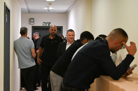 Members of the Knesset’s Foreign Affairs and Defence Committee huddle in a safe room during an Iranian missile attack on June 22, 2025. Photo by Yoav Dudkevitch/TPS-IL