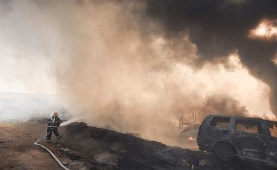 An Israeli firefighter works to extinguish a blaze caused by an incendiary device launched from the Gaza Strip into southern Israel on June 27, 2019. Credit: Israel Fire and Rescue Services