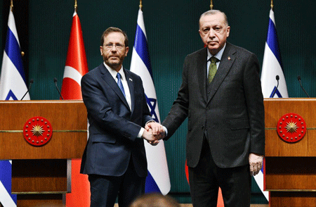 Israeli President Isaac Herzog (left) visits Turkish President Recep Tayyip Erdoğan in Ankara on March 9, 2022. Photo by Haim Zach/GPO