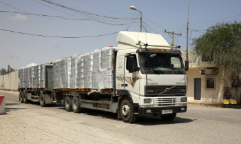 A truck loaded with humanitarian aid passes through the Kerem Shalom border crossing, the main passage point for goods entering the Gaza Strip from Israel, May 21, 2021. Photo by Abed Rahim Khatib/Flash90.