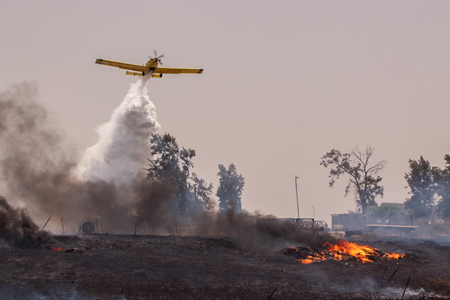 A firefighting plane works to extinguish a wildfire in Moshav Kedma, in south-central Israel, May 31, 2021. Photo by Gershon Elinson/Flash90.