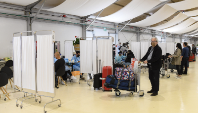 Medical technicians test passengers for COVID-19 at Ben-Gurion International Airport