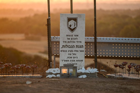 The memorial site on the Israel-Gaza border near the Nahal Oz army base on July 11, 2024, where 53 soldiers were killed and 10 take captive during Hamas’s October 7 attack. Photo by Kobi Richter/TPS-IL