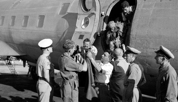 Yemenite immigrants being greeted by Jewish Agency representatives at Israel’s Lod Airport in 1949. Credit: National Photo Collection/Government Press Office.