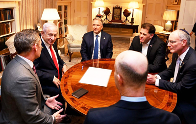 Israeli Prime Minister Benjamin Netanyahu meets with US special envoy Steve Witkoff and National Security Adviser Michael Waltz, accompanied by Strategic Affairs Minister Ron Dermer, National Security Adviser Tzachi Hanegbi, Ambassador to the US Yechiel Leiter, and Chief of Staff Tzachi Braverman in Washington on Feb. 4, 2025. Photo by Avi Ohayon/GPO/TPS-IL
