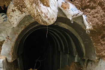 UNRWA sacks filled with sand lining a Hamas terror tunnel under Al Azhar University in central Gaza.   Photo by TPS