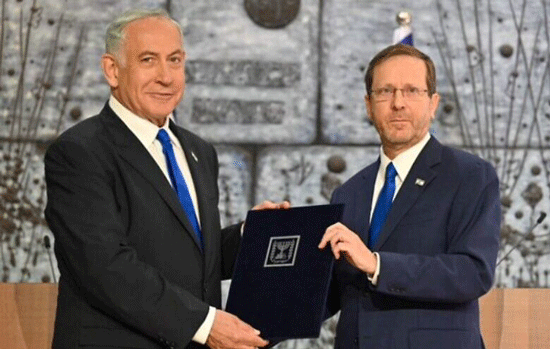 Prime Minister-designate Benjamin Netanyahu accepts the mandate to form a government from Israeli President Isaac Herzog, Nov. 13, 2022. Photo by Kobi Gideon/GPO.