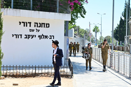 Israeli soldiers and Haredim at the entrance to an Israel Defence Forces recruitment office in Ramat Gan on June 25, 2023. Photo by Yossi Zeliger/TPS