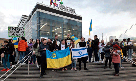 Demonstrators hold placards against Putin and Ukrainian flags, protest in the city of Nahariyya against the Russian invasion of Ukraine. Nahariyya, Feb 26 Photo by Sara Yahimovich/TPS
