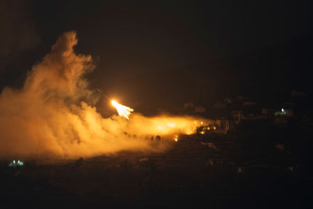 Israeli shelling hit an area in southern Lebanon as seen from northern Israel, early Tuesday, Oct. 1, 2024. (AP Photo/Leo Correa)