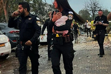 Police officer Staff Sgt. Aviv Saranga holding a three-month-old baby after she was pulled out of rubble in Rishon Letzion created by an Iranian ballistic missile strike on June 14, 2025. Photo by Dvir Mor/Israel Police.