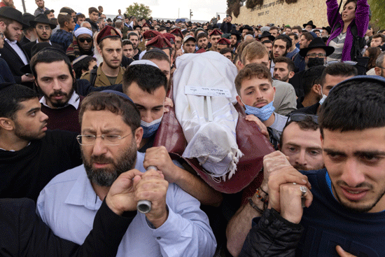 Friends and family attend the funeral of Eliyahu Kay, a 25-year-old immigrant from South Africa who was killed in a terror attack in Jerusalem’s Old City, at Har HaMenuchot Cemetery in Jerusalem on Nov. 22, 2021. Photo by Olivier Fitoussi/Flash90.