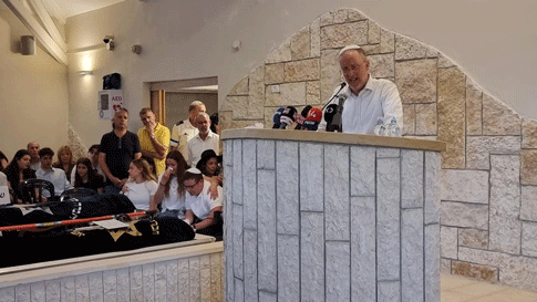 Rabbi Leo Dee speaking at the funeral of daughters Maya and Rina on April 9, 2023, who were killed in a Palestinian terror attack. Rabbi Dee’s wife Leah (Lucy) died of her injuries the day after Maya and Rina were buried. Photo by Meir Elipur/TPS