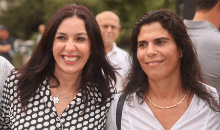 Former Israeli judoka Yael Arad (right) poses with Israeli Culture and Sports Minister Miri Regev outside the 43rd memorial service for the 1972 Munich Massacre in Tel Aviv on Sept. 9, 2015. Photo by Flash90.