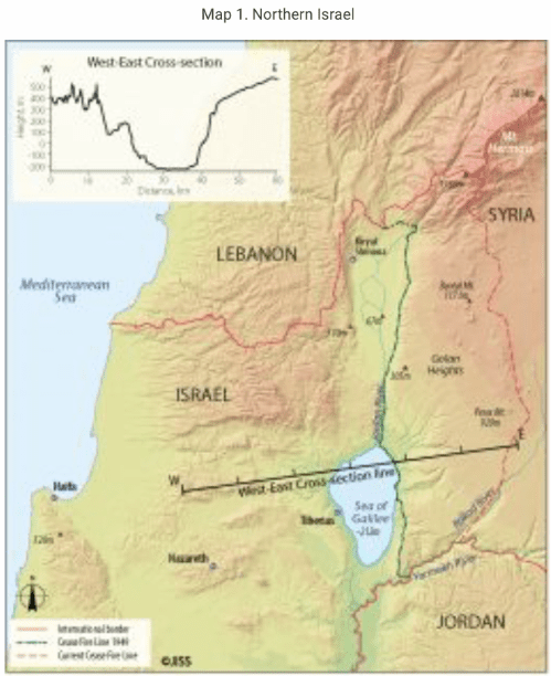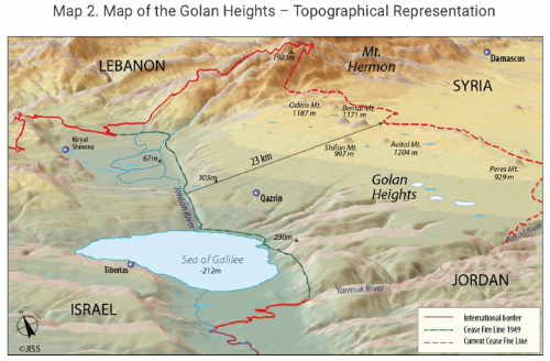 The Golan Heights is a rocky plateau, mostly ranging from 1,000 to 1,200 meters – an area totalling 1,800 km2(695 square miles) north-east of Israel (see Map 1). The Jordan River and the Sea of Galilee mark its western border, the Yarmuk River demarcates its southern end, and the watershed line bounds it on the east (see Map 2). Mount Hermon (partially in Israeli territory) marks the northern end of the Heights. The mountain provides excellent means to observe the entire region, up to Damascus, only some 60 kilometres away to the east, and over to the Haifa Bay on the Mediterranean to the west (see Map 3). The Golan Heights dominate the Jordan River Valley, the Israeli Galilee to its west, and the approaches to Damascus to its east.