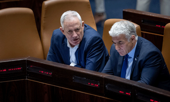 Foreign Minister Yair Lapid and Defense Minister Benny Gantz attend a plenum session at the Knesset in Jerusalem on June 20, 2022. Photo by Yonatan Sindel/Flash90