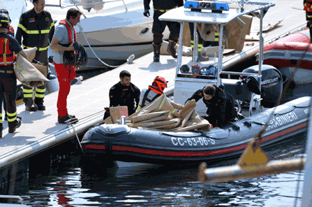 Carabinieri and fire brigade officers take part in the search and rescue operation in Lake Maggiore after a tourist boat capsized near Lisanza (Varese), northern Italy, 29 May 2023. Photo: PURICELLI