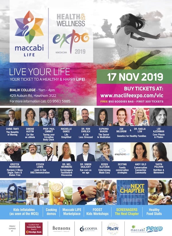 The Maccabi LIFE Health & Wellness Expo will bring together leading professionals, speakers and exhibitors at an informative and fun day – out that will get you and your family thinking about health and well-being.