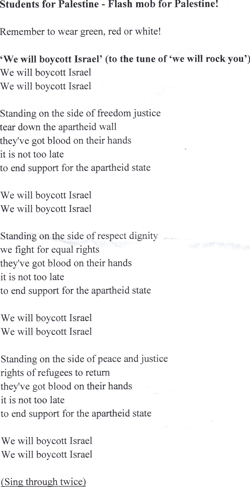 Louise hands me a song sheet, telling me that they will be trying something different at this protest. The words are about as corny as they can get: instead of “we will, we will rock you”, we are expected to sing “we will boycott Israel”.