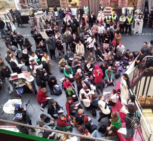 As they begin to sing, I notice that quite a few shoppers and commuters stop to watch, wondering what it’s all about. I hear one observer shout “yeah, go for it” but I don’t see anybody join in.