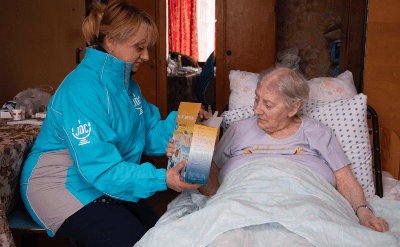 Continuing JDC’s long-held tradition of matzah delivery for Passover, a volunteer provides matzah to elderly client in Odessa, Ukraine. Credit: Courtesy.